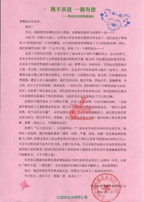 龙神合作伙伴昆明松骋的虎年祝福与感谢信
