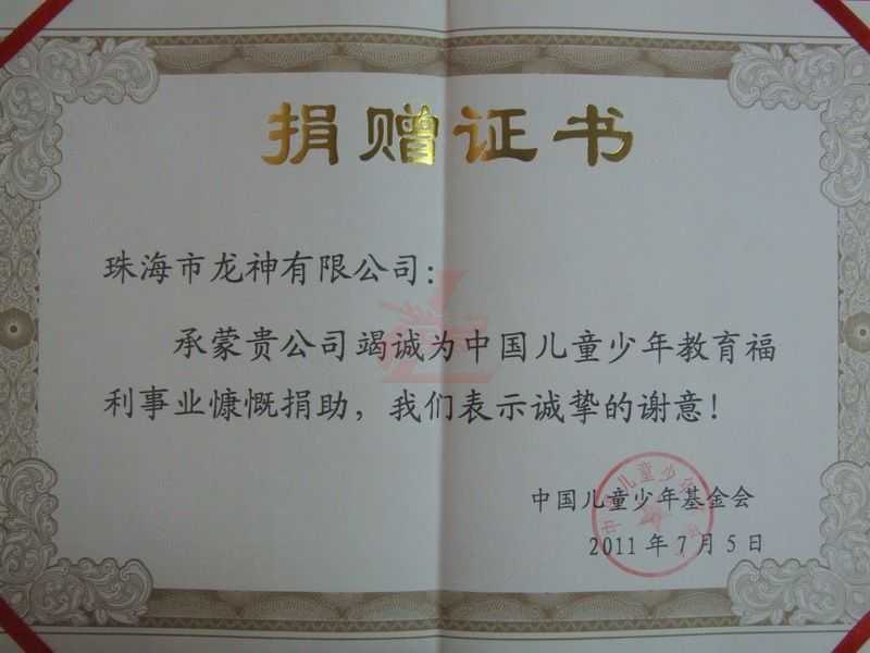 龙神为中国儿童基金会捐爱心 2011年7月5日,纪念中国儿童少年基金会成立30周年爱心单位和个人捐赠仪式在北京人民大会堂举行。全国人大常委会副委员长陈至立出席捐赠仪式,为爱心单位和个人颁发捐赠证书并讲话。 我司为支持中国儿童少年基金会的发展捐献了自己的爱心,为着祖国的未来贡献一份绵力。 陈至立发表讲话 我司代表陈经理获爱心单位捐赠证书 捐赠仪式现场 受社会各界关心的春蕾班小朋友表演舞蹈以表感谢 中国儿童少年基金会 2011-08-05 12102