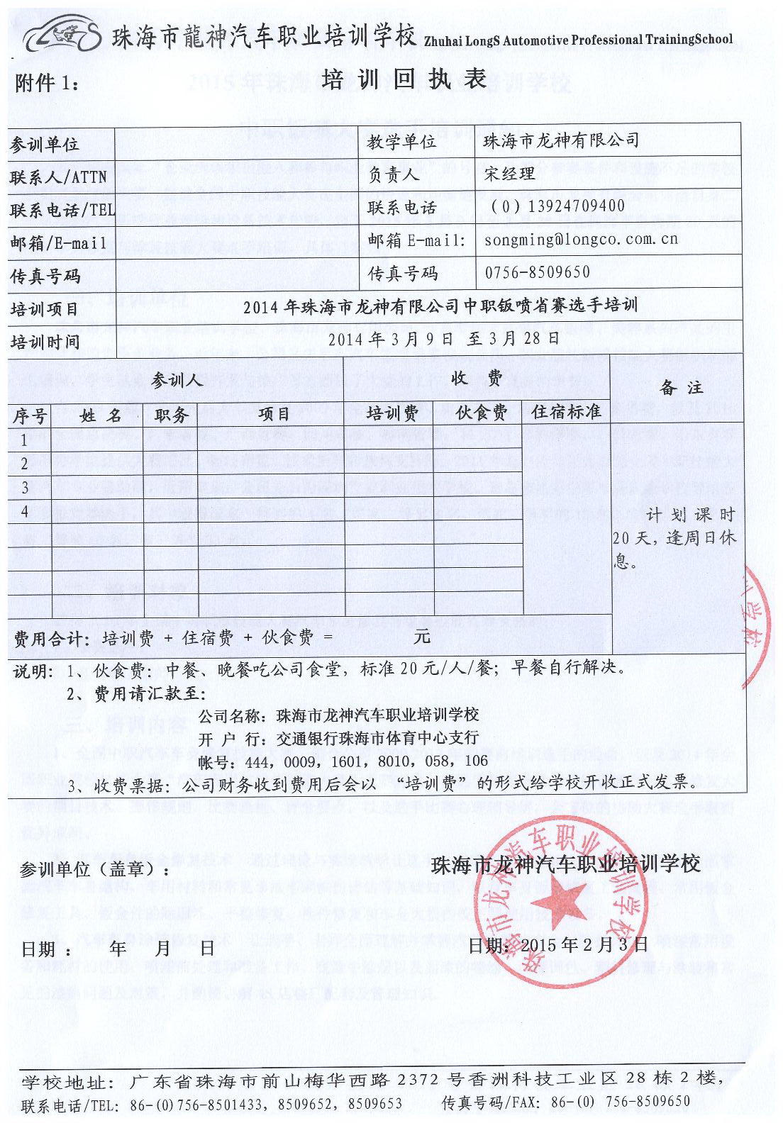 附件1: 培 训 回 执 表