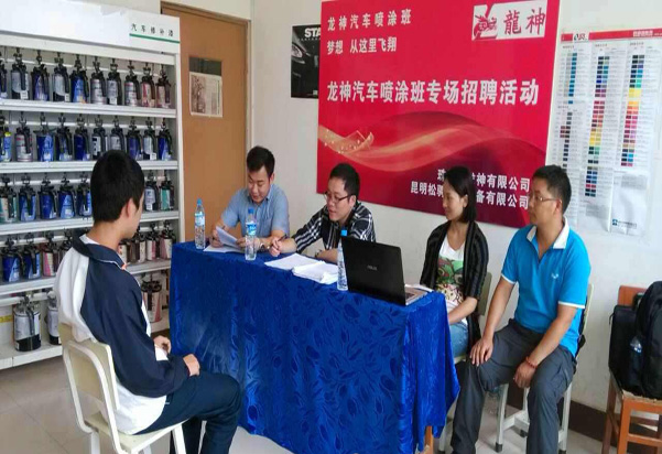 珠海龙神有限公司携手昆明松骋汽修设备有限公司与昆明市官渡区职业高级中学建立更深层次的校企合作关系,开办龙神喷涂班。现场选拔面试会已于2014年6月24日在昆明市官渡区职业高级中学隆重举行!
